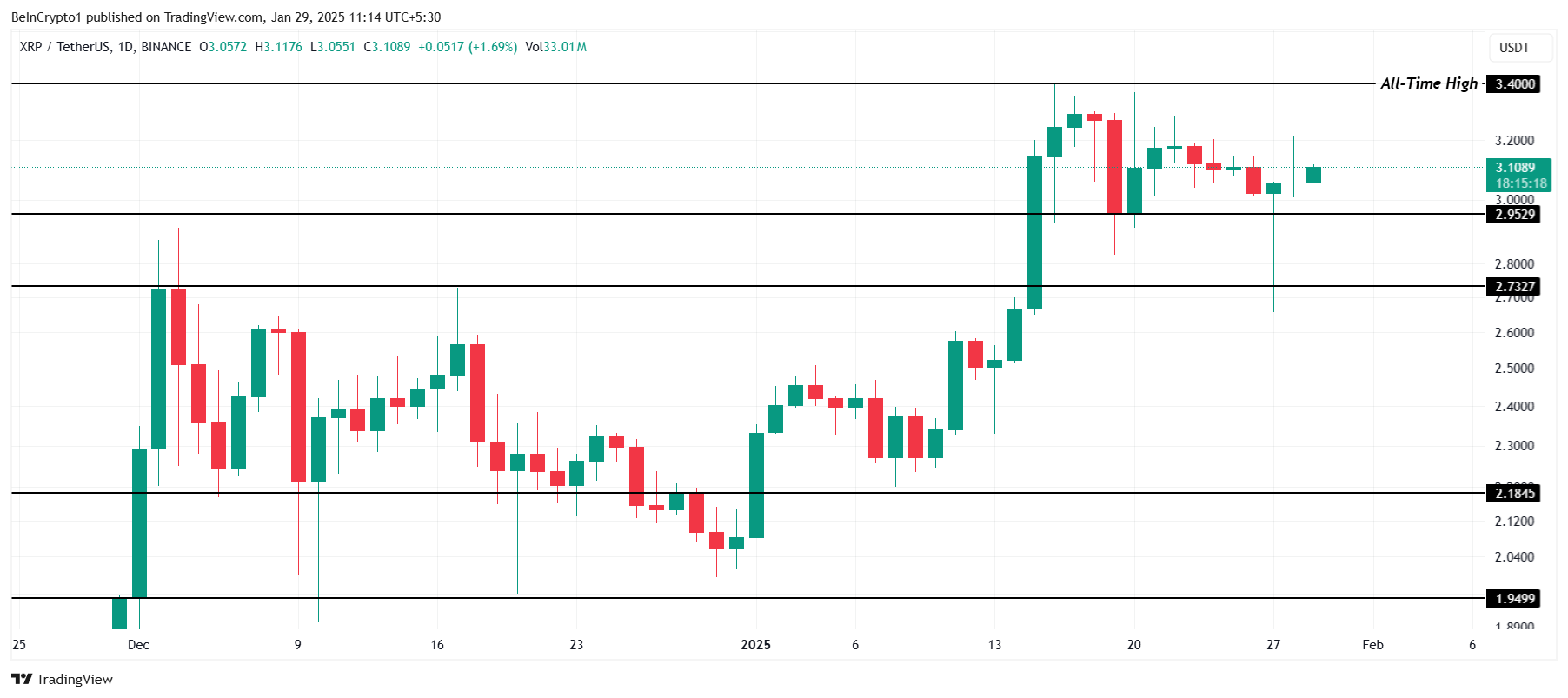 وقت كتابة هذا التقرير، يتم تداولXRP عند 3,10$، محافظًا على مستوى الدعم 2,95$. تم اختبار هذا العتبة مرتين في الأيام العشرة الماضية، مما يبرز أهميتها في منع المزيد من الانخفاضات. قد يؤدي الدفاع الناجح عن هذا المستوى إلى تمهيد الطريق لارتفاع محتمل.
