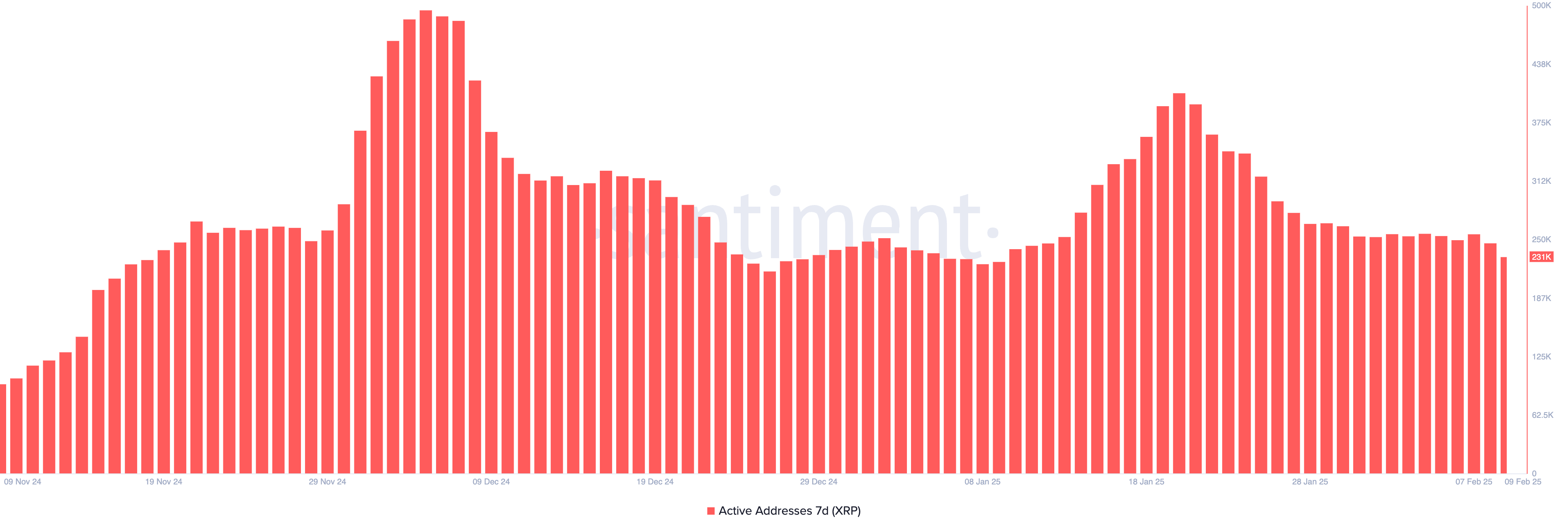 بلغت العناوين النشطة لـ XRP لمدة 7 أيام ذروتها مؤخرًا عند 495000 في 5 ديسمبر 2024، قبل أن تتراجع. حدثت زيادة أخرى في منتصف يناير 2025، حيث وصلت إلى 407000 في 20 يناير، لكن النشاط انخفض بشكل مطرد منذ ذلك الحين.