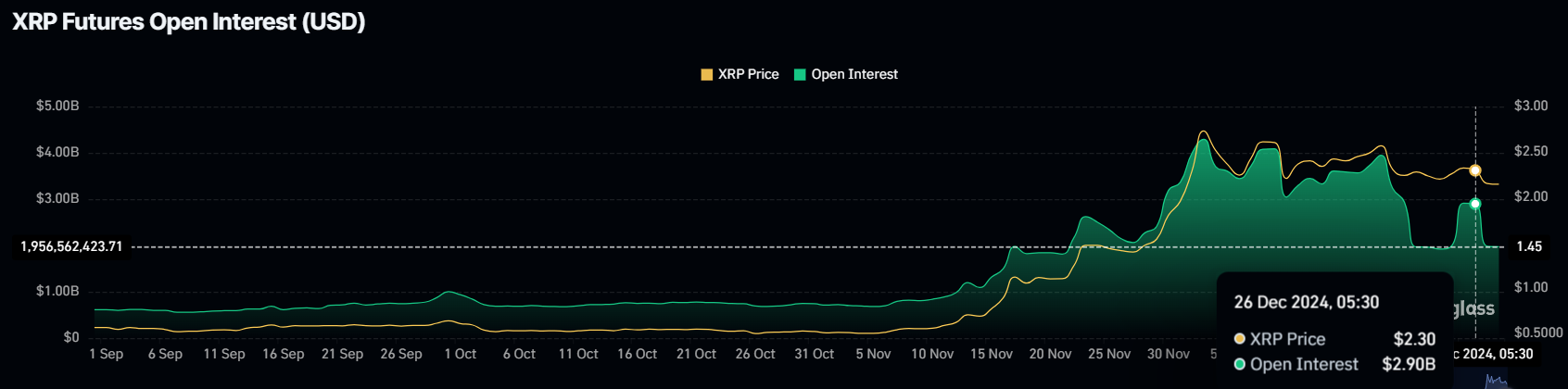 انخفضت الفائدة المفتوحة (OI) في عقود إكس آر بي الآجلة بمقدار 1 مليار دولار في الـ 24 ساعة الماضية، مما يشير إلى فقدان قناعة المتداولين. قبل يوم واحد فقط، ارتفعت الفائدة المفتوحة إلى 2,9 مليار دولار، مدفوعة بتوقعات ارتفاع الأسعار. ومع ذلك، عندما فشلت هذه الآمال في التحقق، بدأ المتداولون في سحب أموالهم.