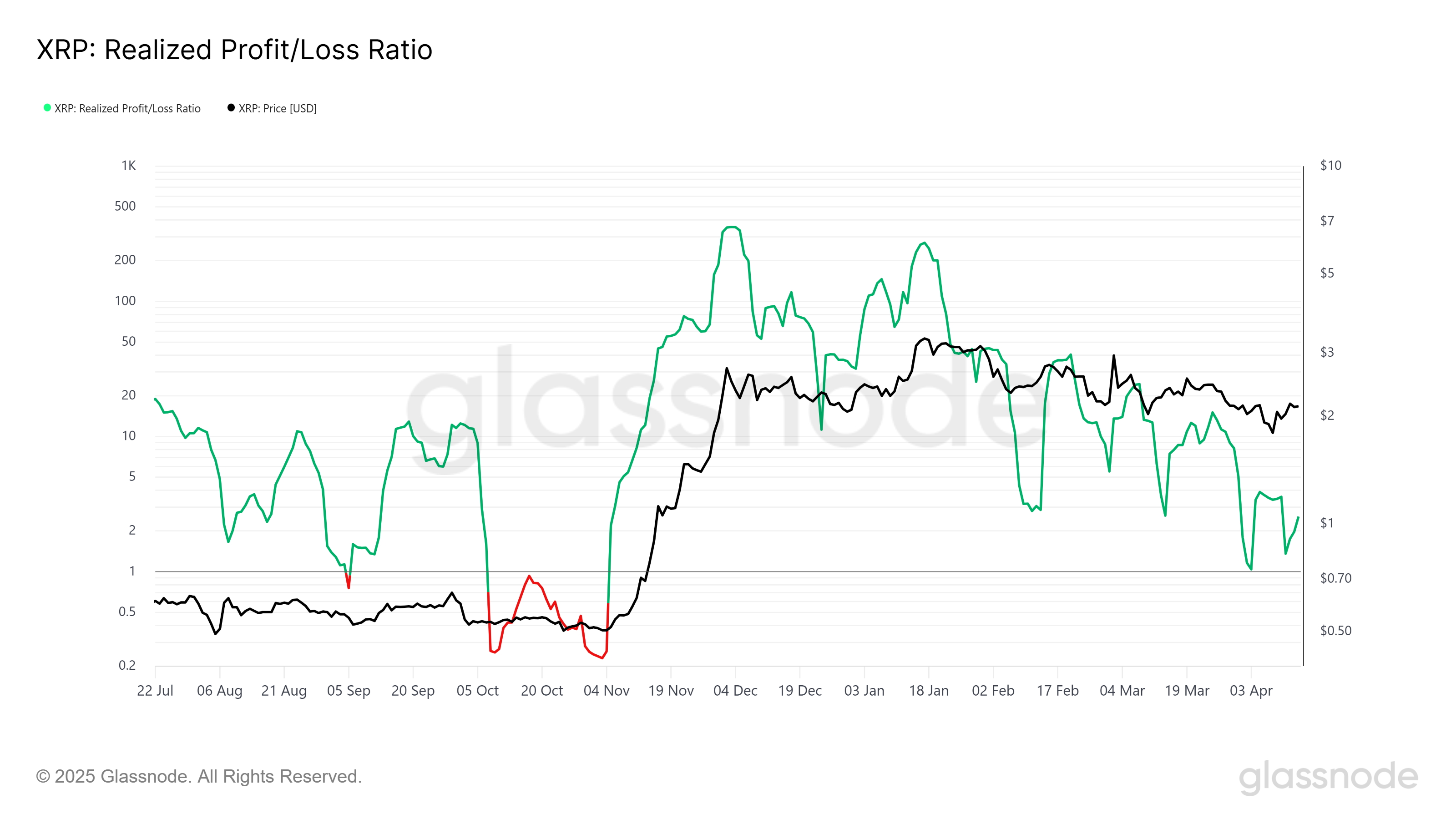 الزخم العام لإكس آر بي يظهر علامات ضعف، كما ينعكس في نسبة الربح/الخسارة المحققة. يشير هذا المؤشر إلى أن الأرباح المحققة تتراجع وقد تتحول قريبًا إلى خسائر. العرض الذي يتم بيعه من المحتمل أن يكون قد نشأ من عمليات شراء تمت خلال فترة الارتفاع الصعودي لإكس آر بي في نوفمبر 2024 عندما ارتفع السعر إلى $2.