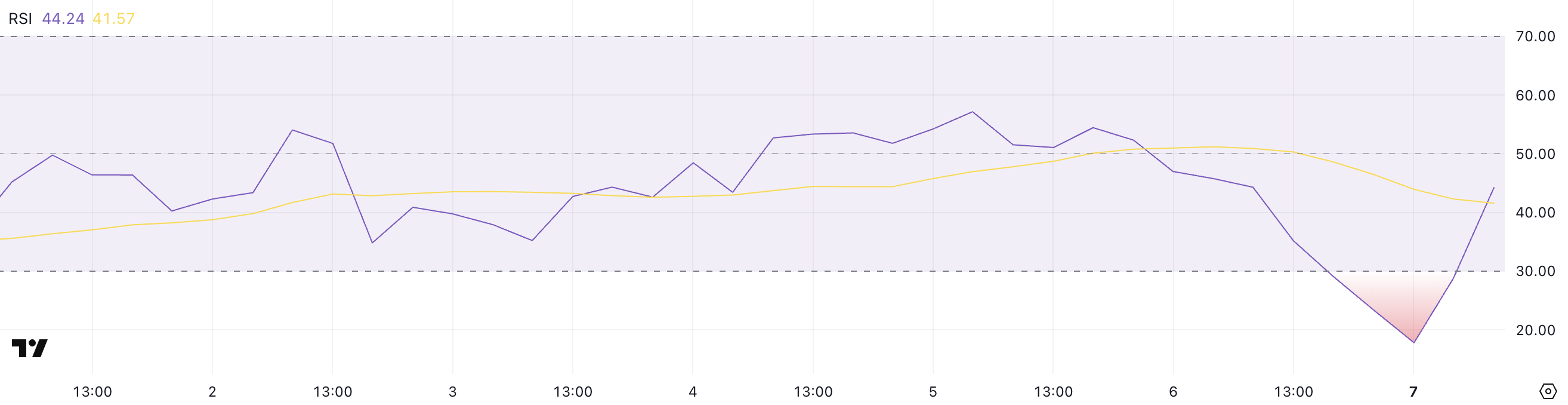 مؤشر القوة النسبية (RSI) لريبل يجلس حاليًا عند 44,24، مرتدًا بعد أن انخفض لفترة وجيزة إلى 17,80 في وقت سابق اليوم - وهو أدنى مستوى له في أسابيع، مع ارتداد سعره بعد الأخبار عن تفكير ترامب في وقف التعريفات لمدة 90 يومًا لجميع الدول باستثناء الصين.
