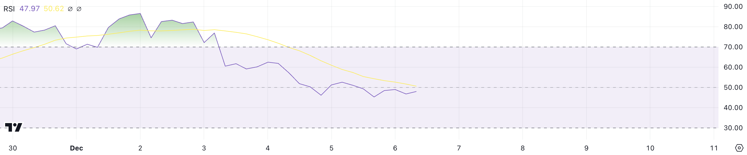 ريبل مؤشر القوة النسبية حاليًا عند 47,9، وهو انخفاض ملحوظ من قيمته السابقة فوق 70 بين 2 ديسمبر و3 ديسمبر. عادةً ما يشير مؤشر القوة النسبية فوق 70 إلى أن الأصل في حالة شراء مفرط، مما يشير إلى أنه قد يكون بحاجة إلى تصحيح أو تراجع.