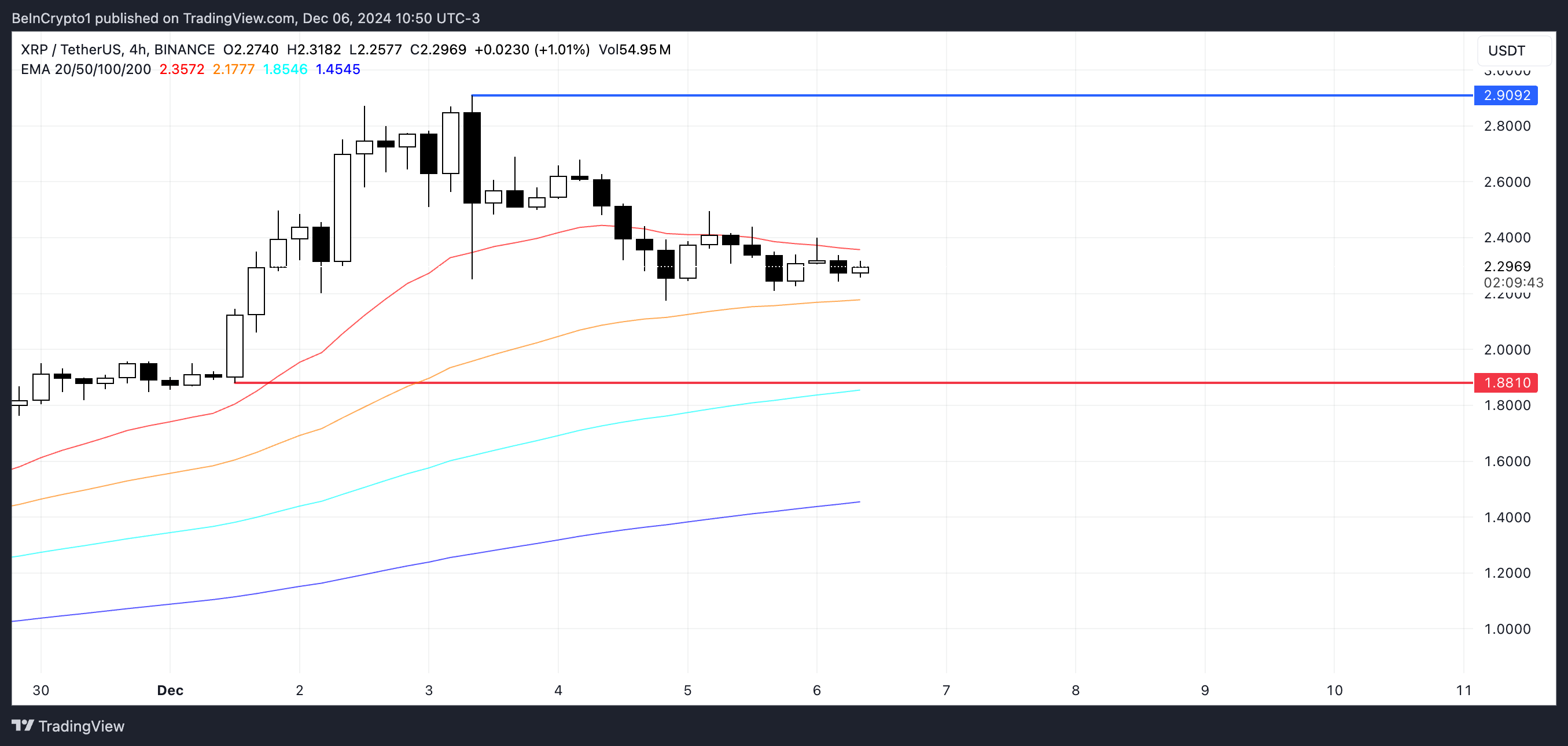 إذا استمر هذا الاتجاه، فقد يواجه سعر XRP ضغطًا هبوطيًا، مما قد يختبر مستوى الدعم عند $1,88.