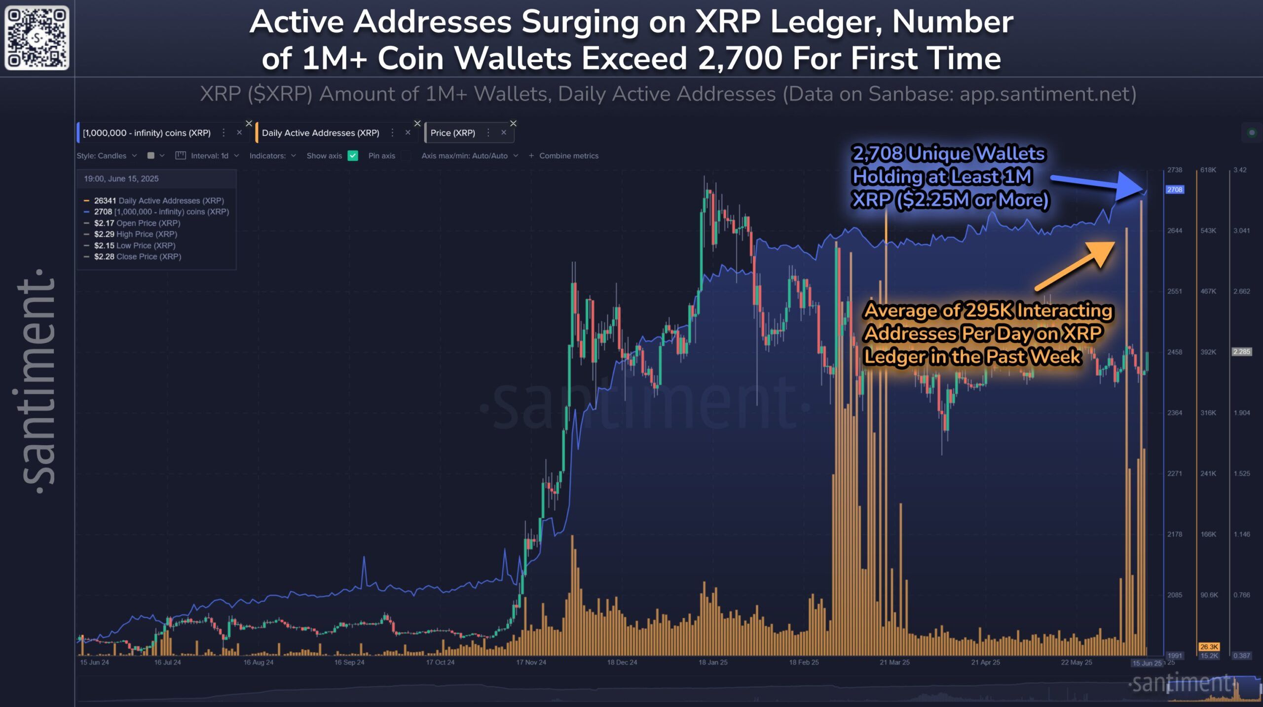 وفقًا لأحدث البيانات من Santiment، تجاوز عدد عناوين XRP النشطة يوميًا 295,000 خلال الأسبوع الماضي. هذا أعلى بعدة مرات من المتوسط الذي يتراوح بين 35,000–40,000 عنوان يوميًا في الأشهر الثلاثة الماضية.